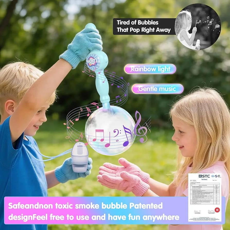 Această jucărie oferă momente de distracție și stimulează curiozitatea copiilor, transformând baloanele de săpun într-un joc interactiv și captivant.