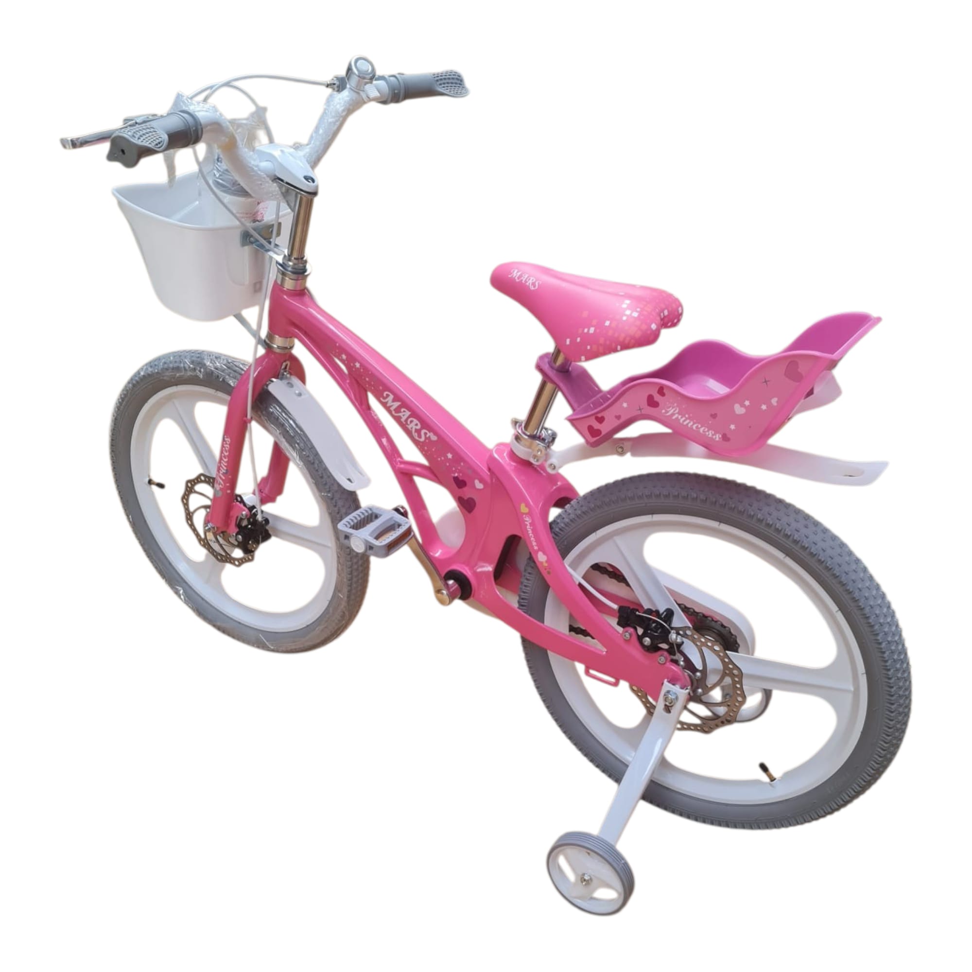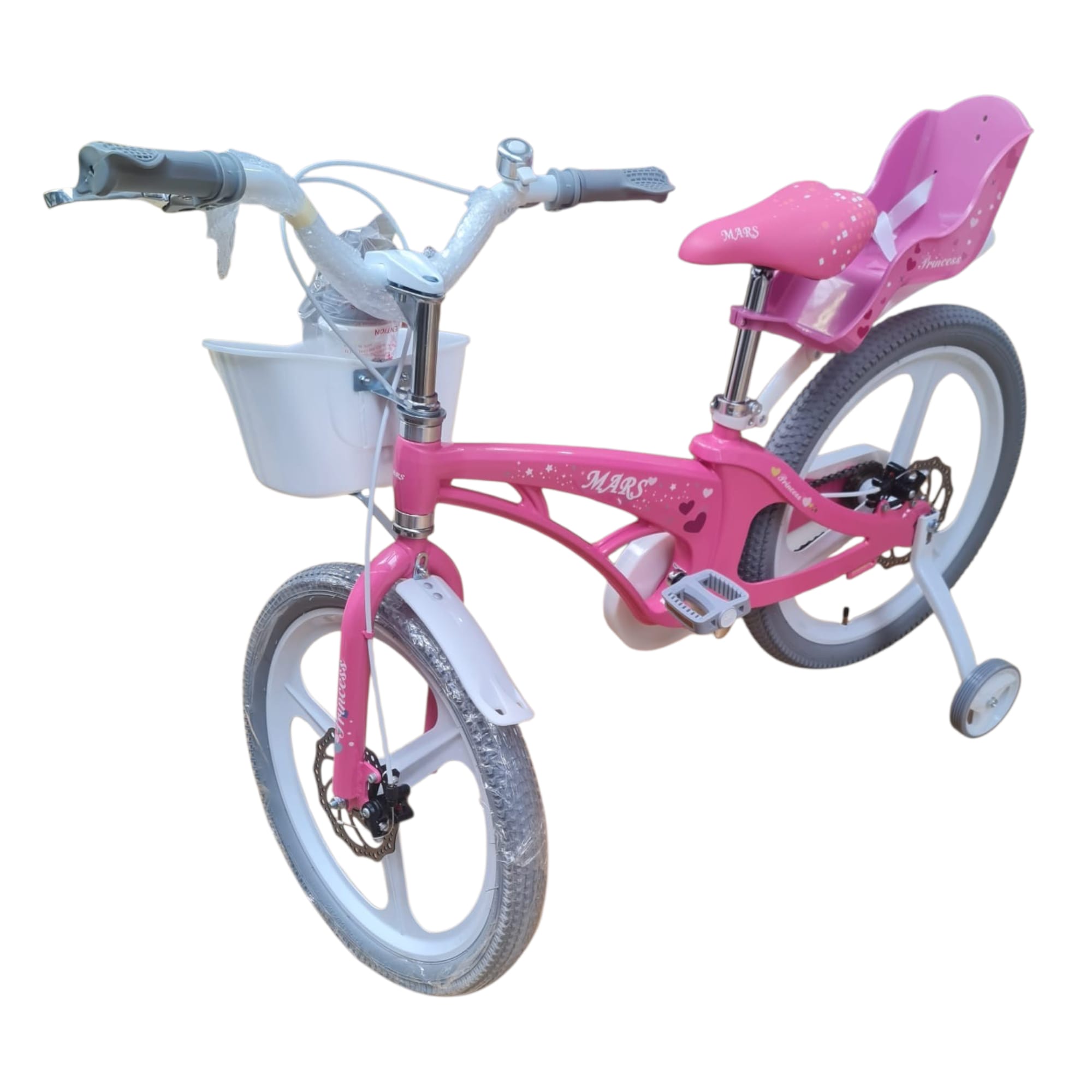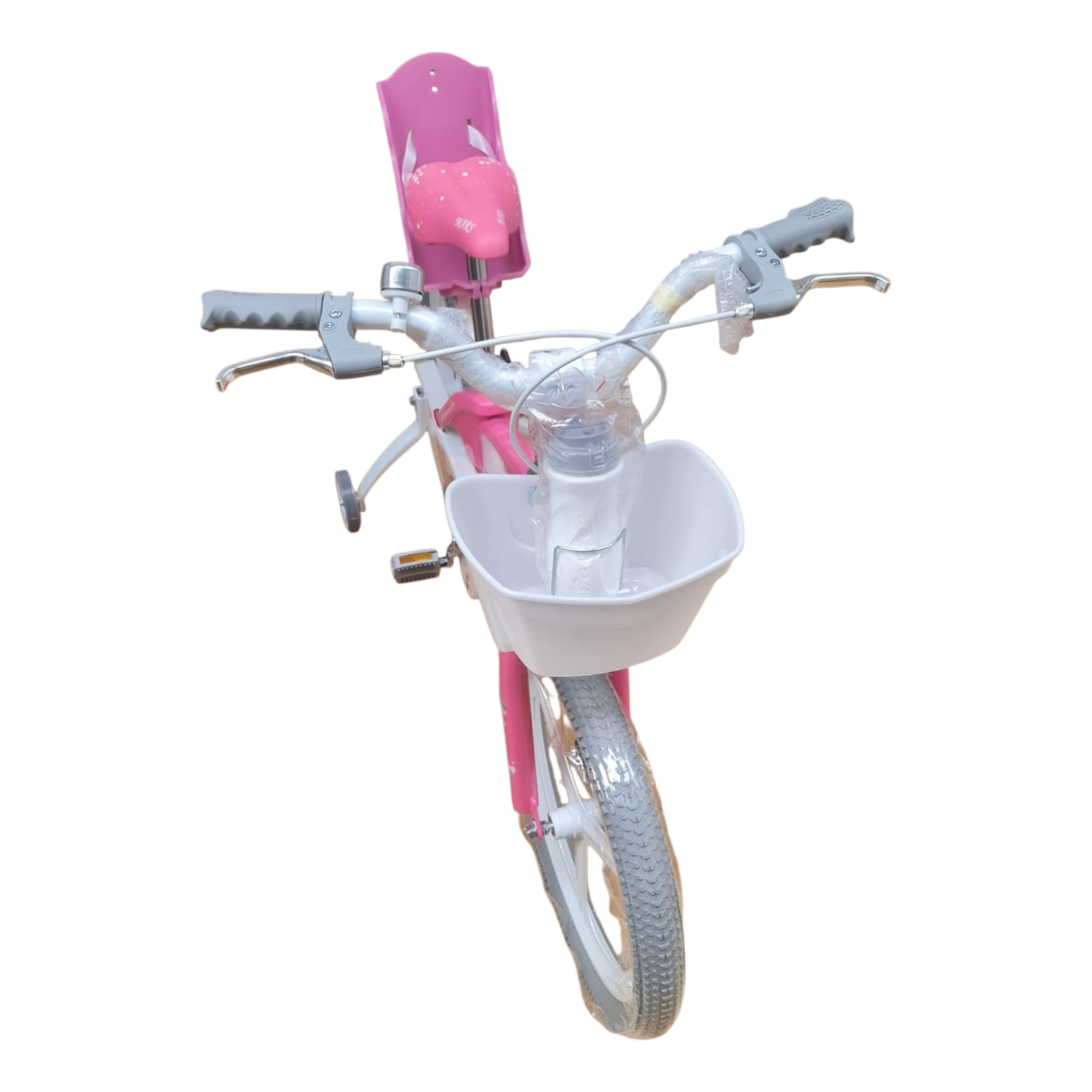 Bicicleta este dotată cu coș frontal din plastic, util pentru transportul obiectelor mici, și scaun suplimentar în partea din spate, ideal pentru transportul unei păpuși sau al unei jucării.