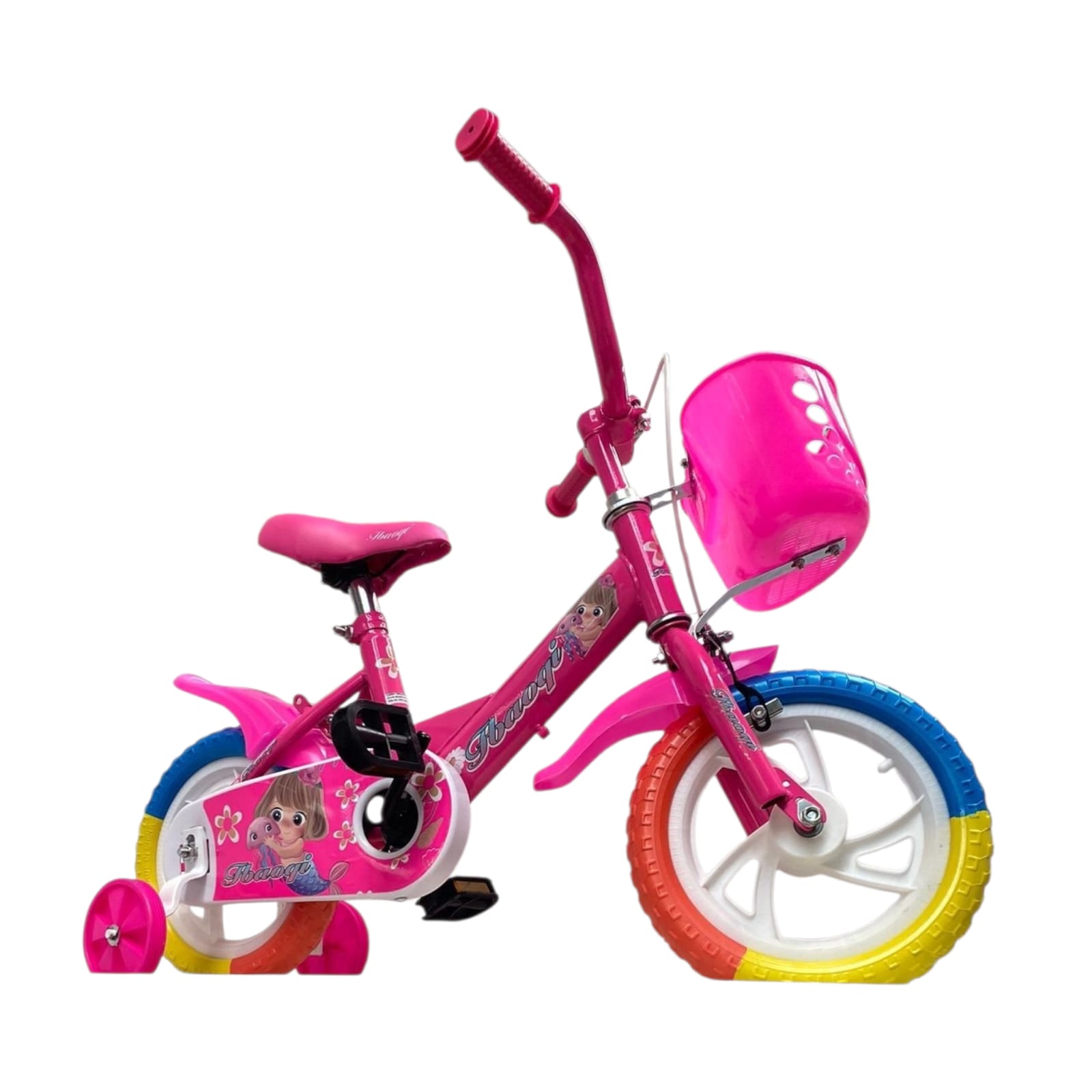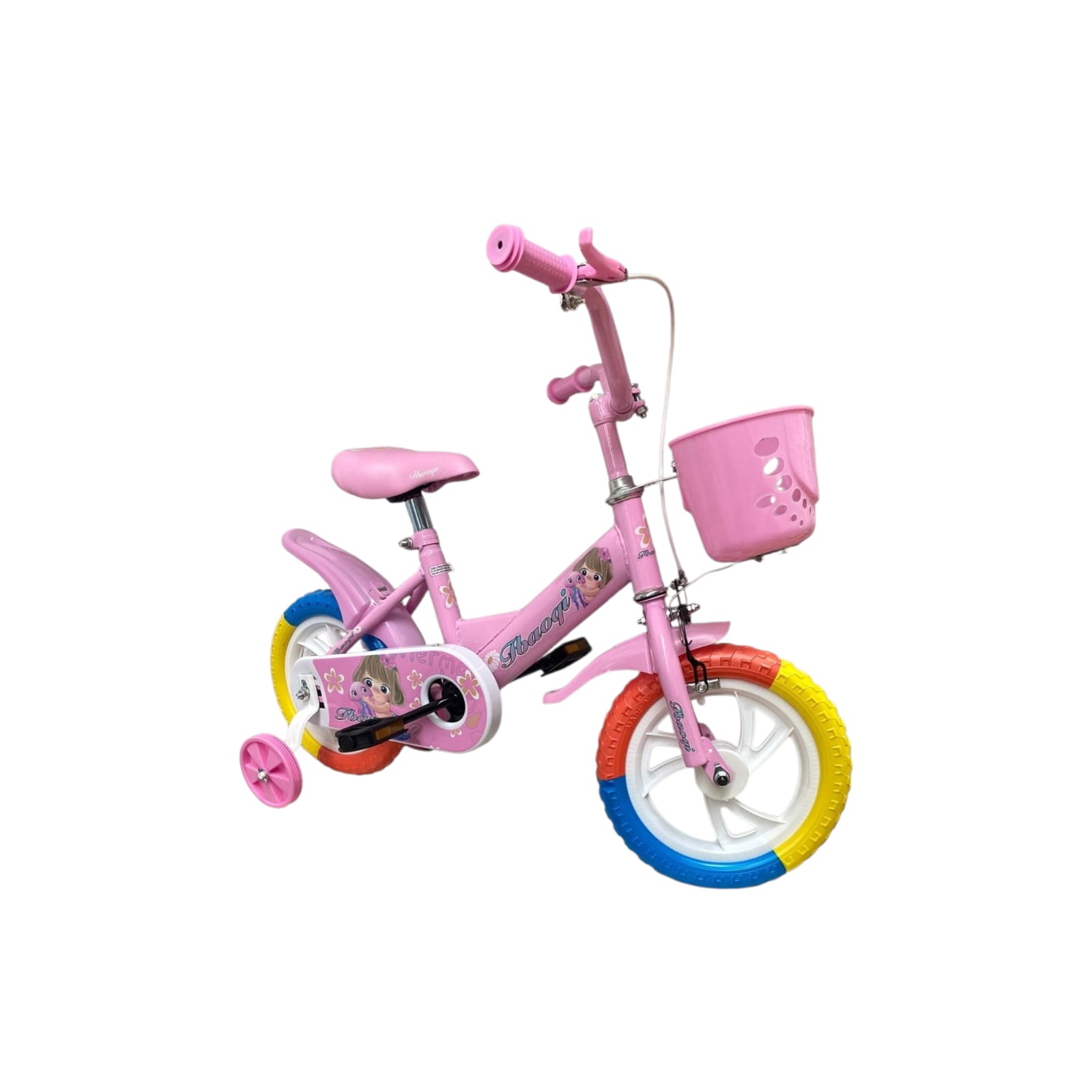 Bicicletă pentru copii 12 inch, cu roți ajutătoare și coș frontal, ideală pentru primele plimbări în siguranță.