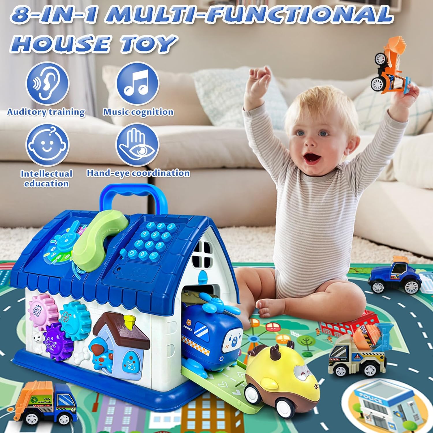 - 1 covoraș cu scenă urbană (70 cm x 50 cm): Ideal pentru jocuri de rol și învățarea traseelor rutiere.