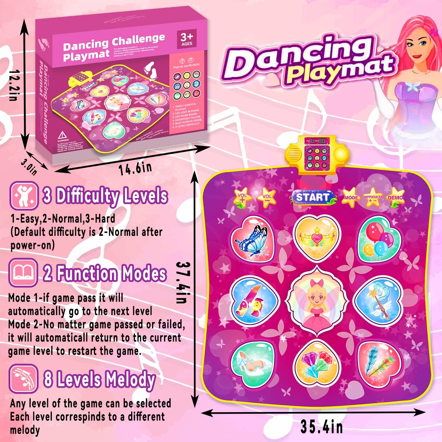 Covorul este decorat cu simboluri vesele – fluturi, baloane, pantofi de dans și alte elemente tematice – care atrag atenția celor mici și îi încurajează să se miște. -