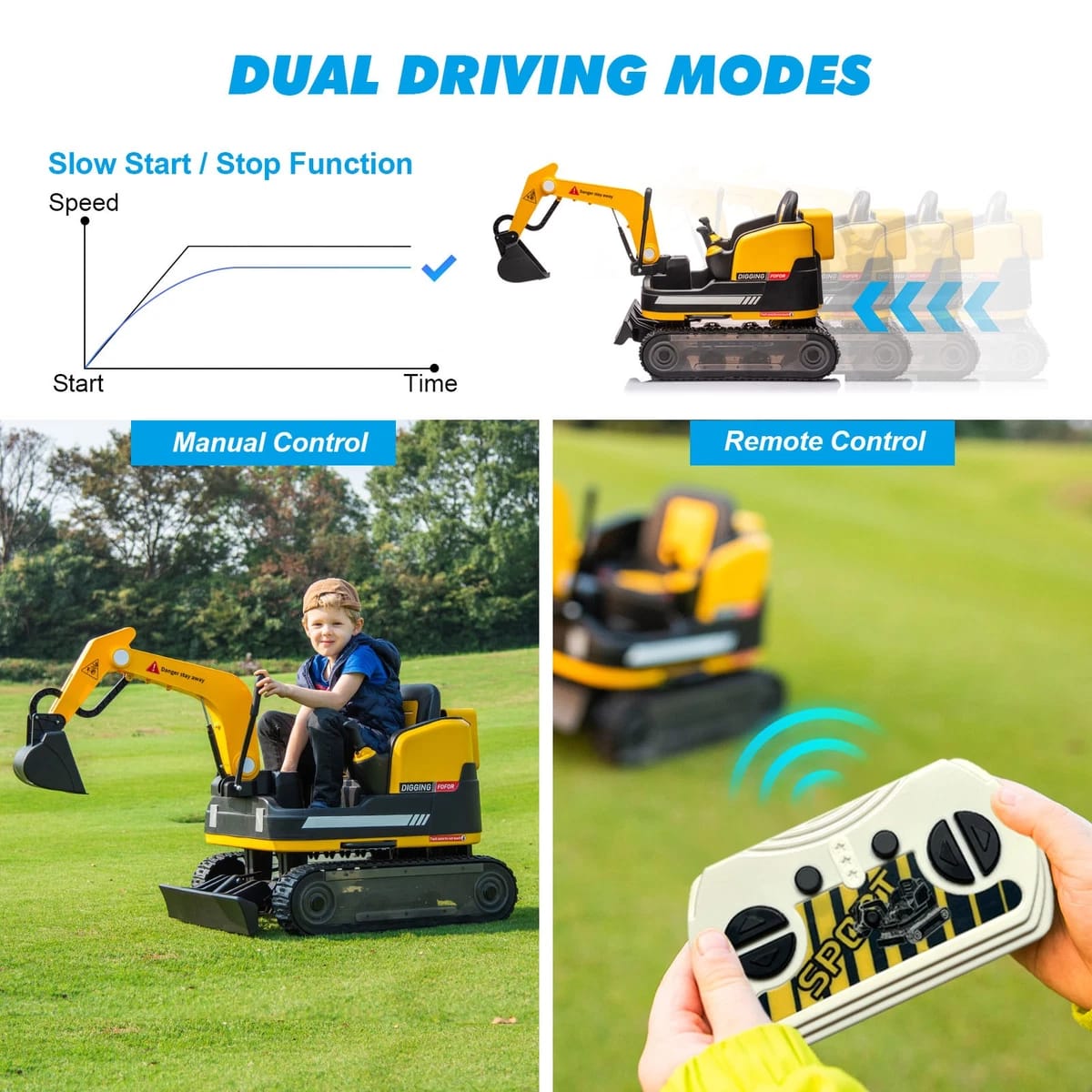 Modul dublu de control: copilul poate conduce manual excavatorul, dar părinții pot prelua controlul cu ajutorul telecomenzii cu 2.4GHz pentru siguranță deplină.
