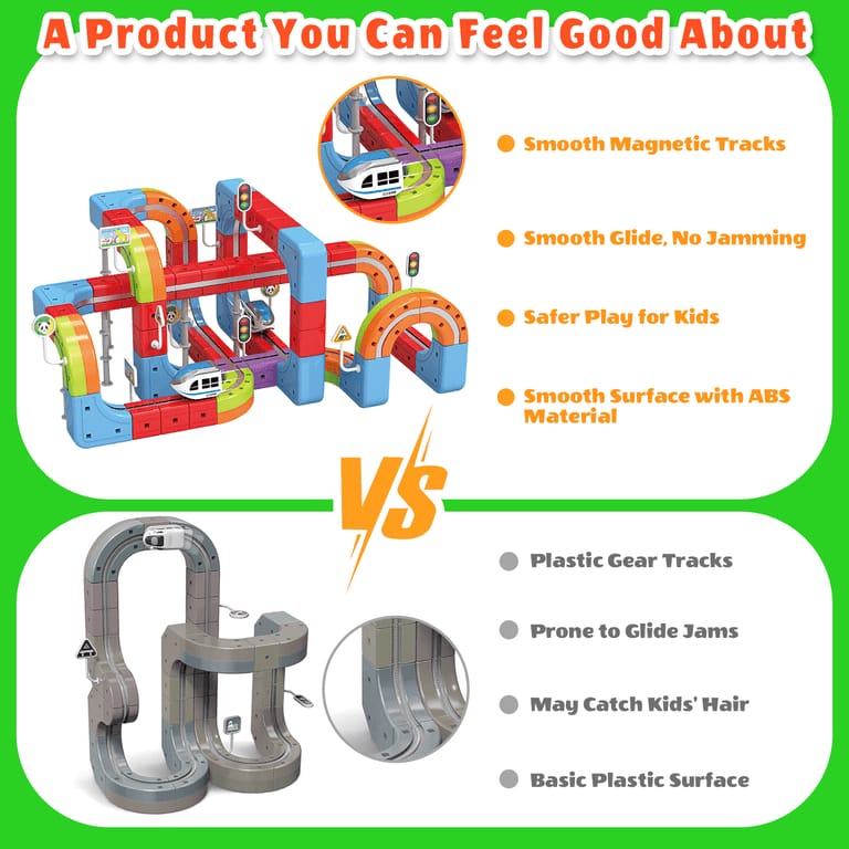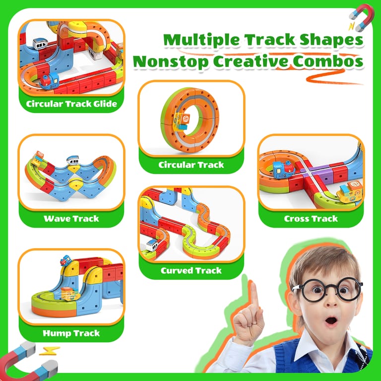 Circuitul include un trenuleț care se deplasează lin pe pista magnetică, oferind o experiență captivantă și realistă. Datorită designului special al șinelor, mișcarea este fluidă și stabilă, fără blocaje.