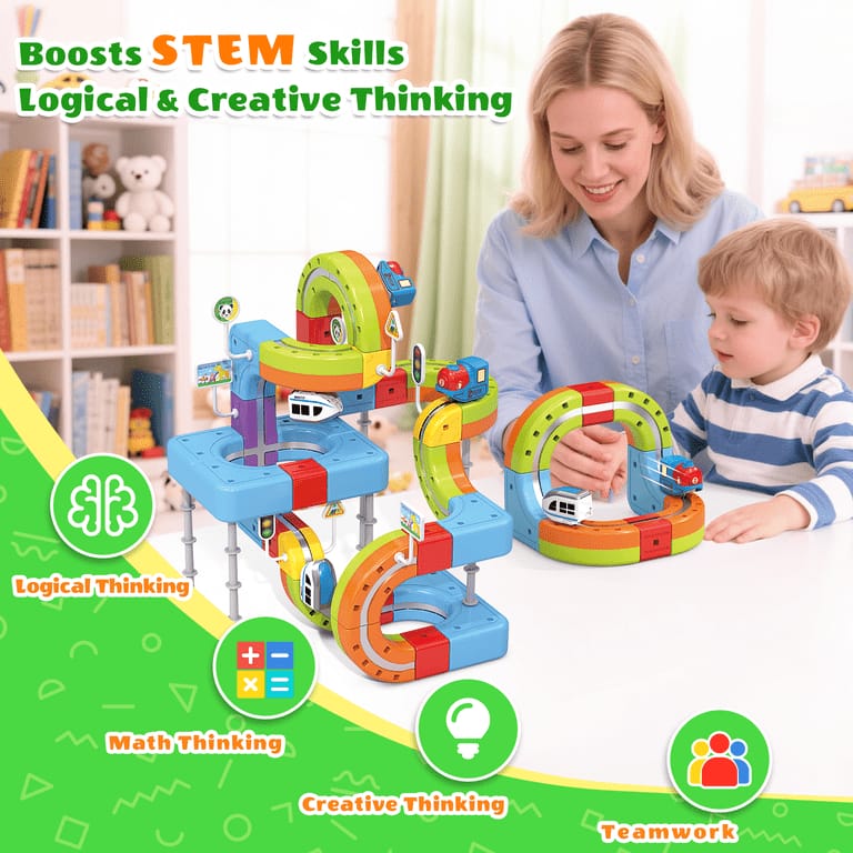 Prin construirea circuitului, copiii își dezvoltă coordonarea, gândirea logică și abilitățile de rezolvare a problemelor, în timp ce își folosesc imaginația pentru a crea trasee noi de fiecare dată.
