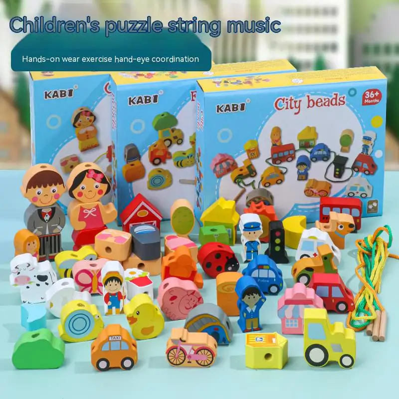 Setul este compus dintr-un snur si 16 piese: o masina de politie, un masina taxi, un autobuz, o locomotiva, o bicicleta, doua masini, 3 casute, un semafor, un copac, un baiat, o fetifa si un agent de politie – toate accesoriile sunt din lemn. Copilul le poate insira pe snur in ordinea dorita de el.