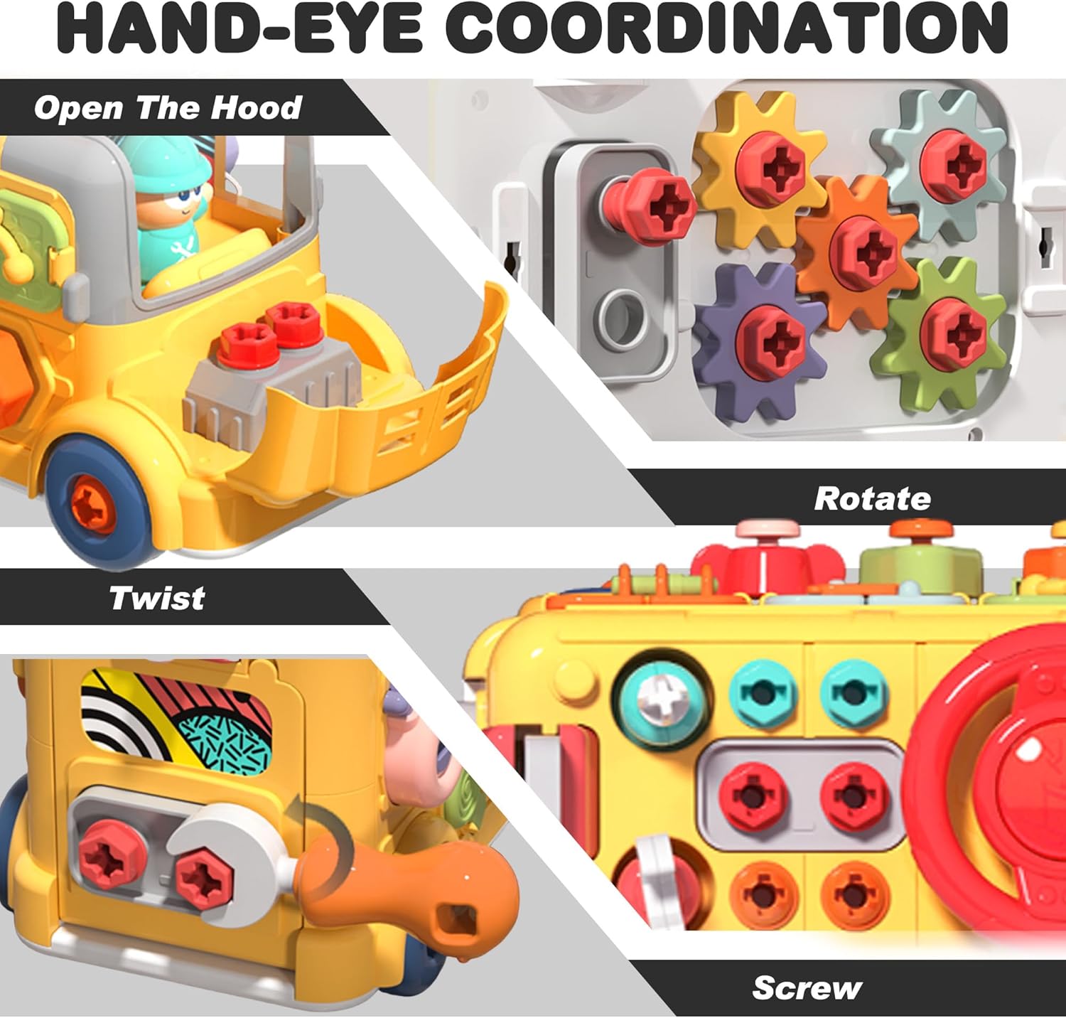 Această jucărie educativă sub formă de autobuz este concepută pentru a sprijini dezvoltarea abilităților motorii fine și a coordonării mână–ochi prin joacă practică și interactivă.