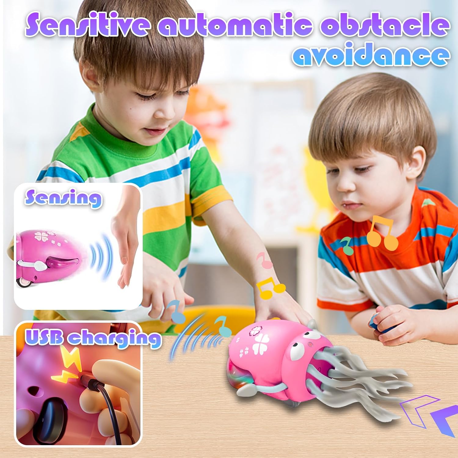 Această caracatiță amuzantă și colorată se mișcă singură, evită obstacolele, luminează și cântă, oferind ore întregi de amuzament pentru cei mici.