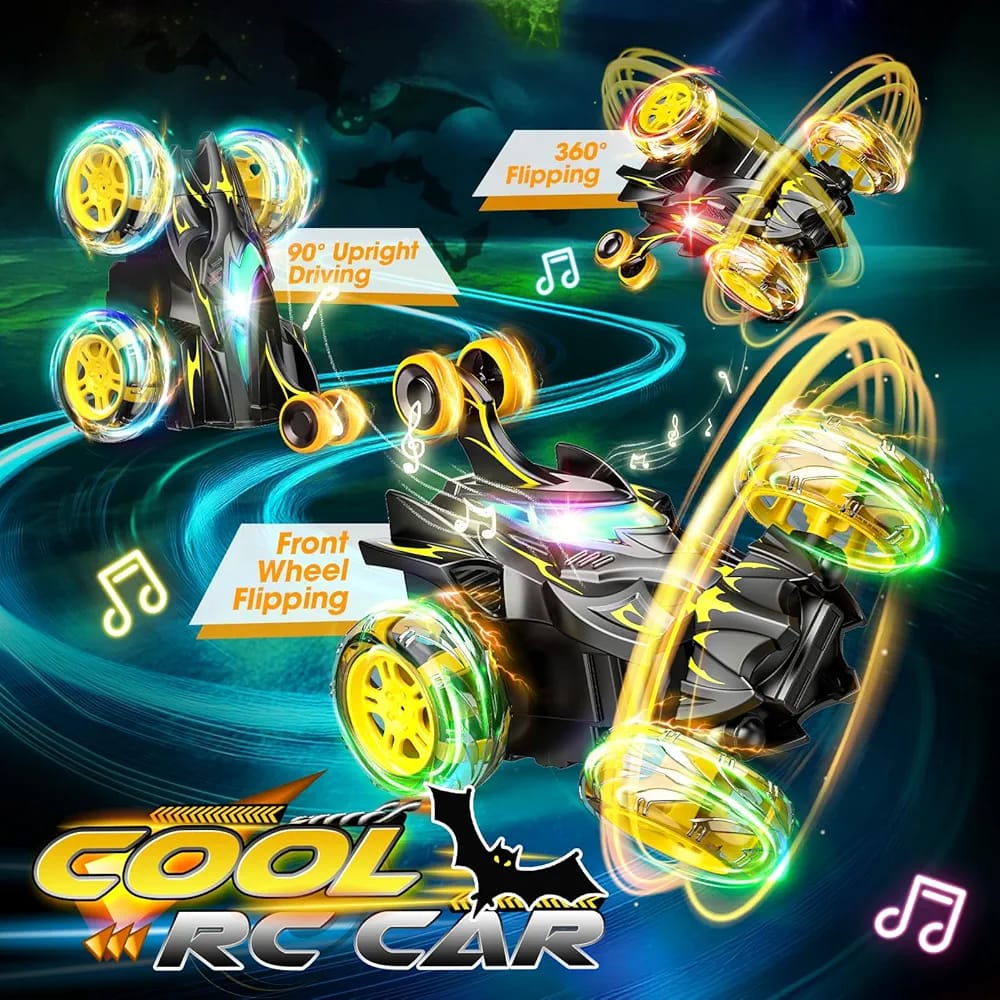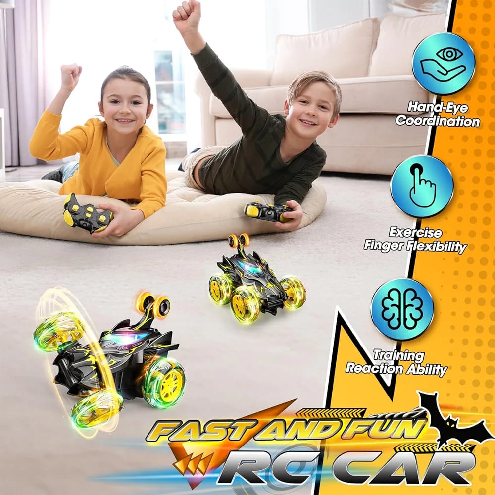 Mașină de cascadorii cu telecomandă, roți luminoase LED și rotație 360°, concepută pentru joacă dinamică și acțiune continuă.