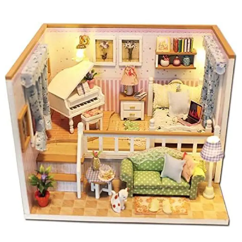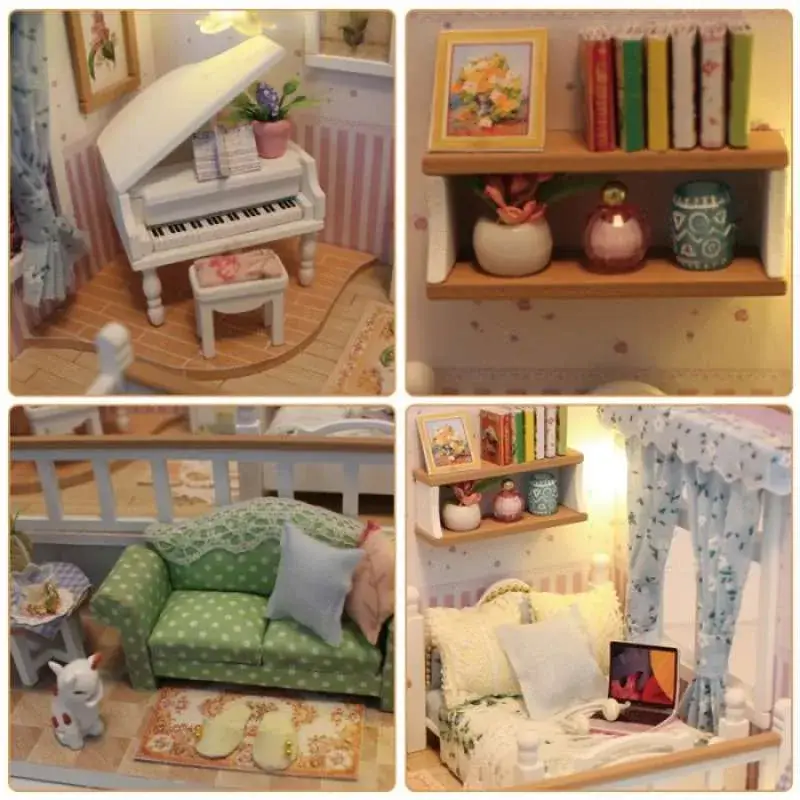 Această căsuță de păpuși în miniatură este un decor sofisticat și detaliat, amenajat într-un stil cald și confortabil, cu un design elegant și romantic. Iată o descriere detaliată a elementelor care o compun: