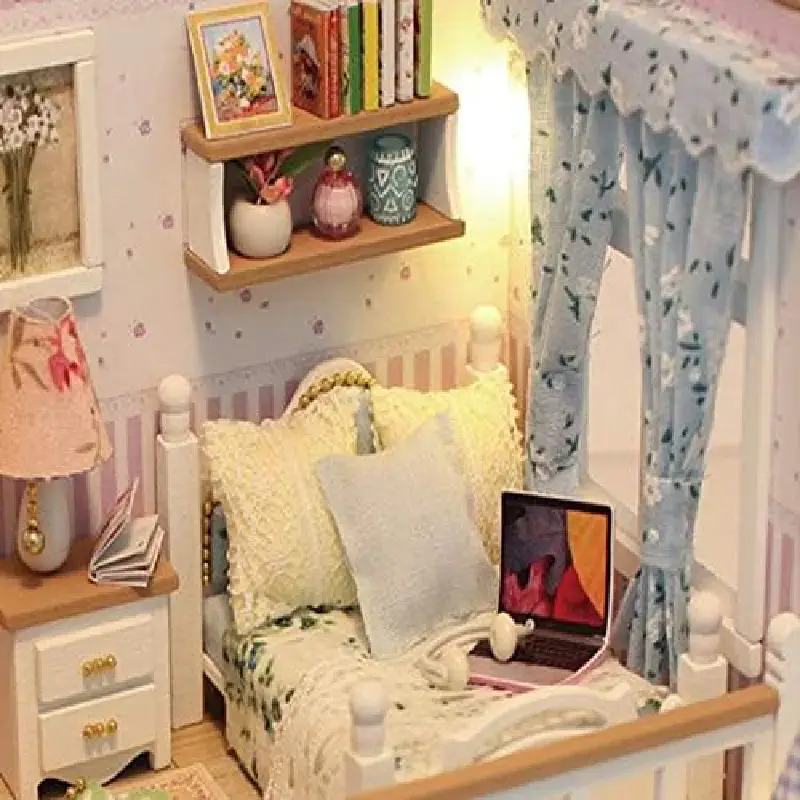 - Pe pat se află un laptop miniatural, sugerând un mediu modern și confortabil.