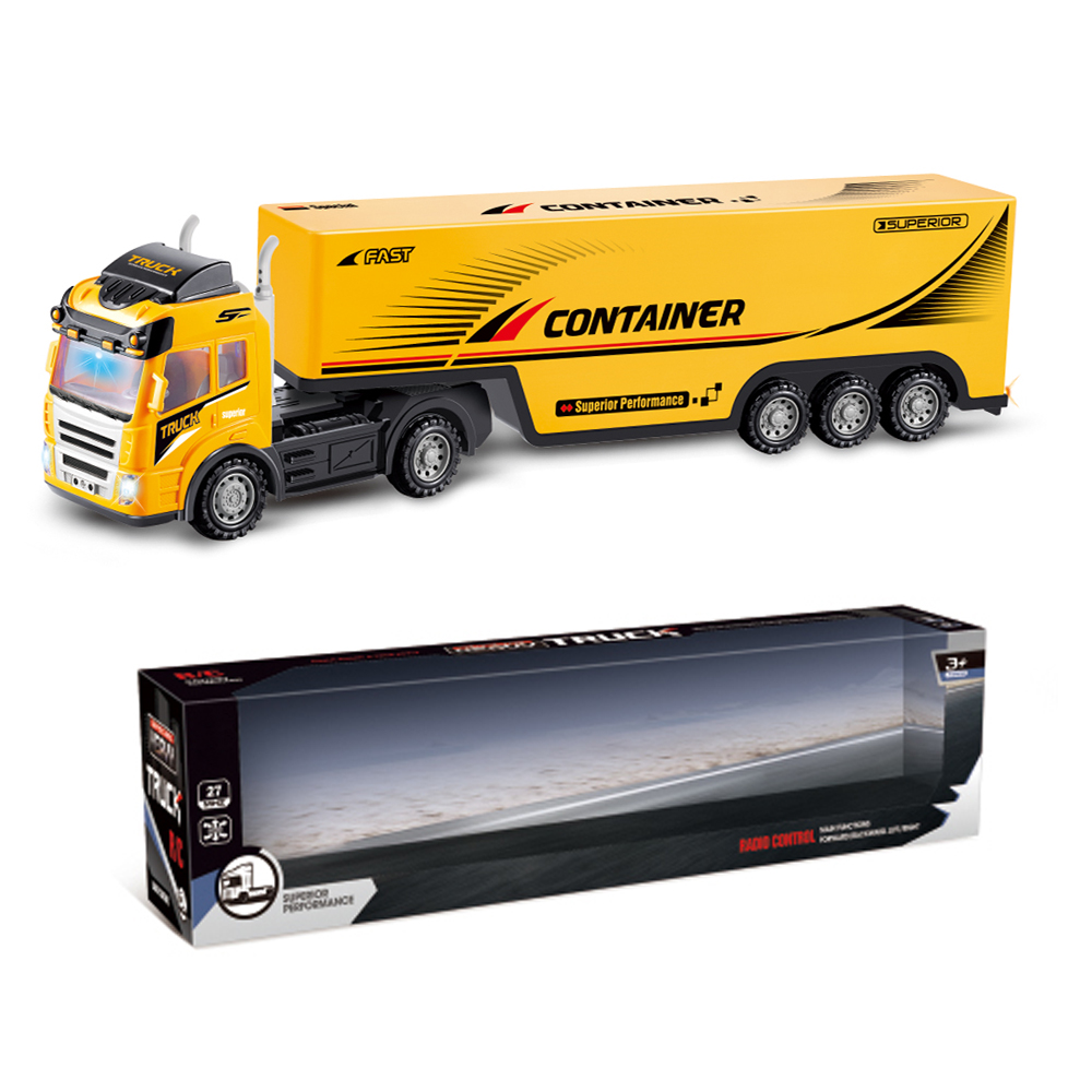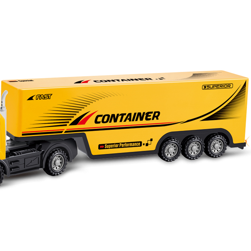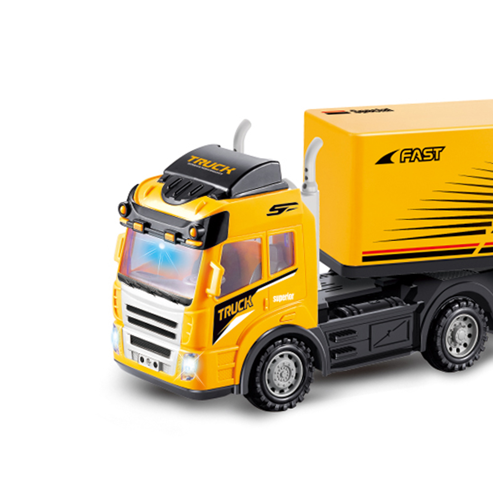 Tirul este vopsit în culori vii, predominant galben, cu inscripții de tip „Container Fast Truck”, redând perfect aspectul unui camion de transport profesional. Farurile frontale se aprind în timpul mersului, adăugând un plus de realism. -