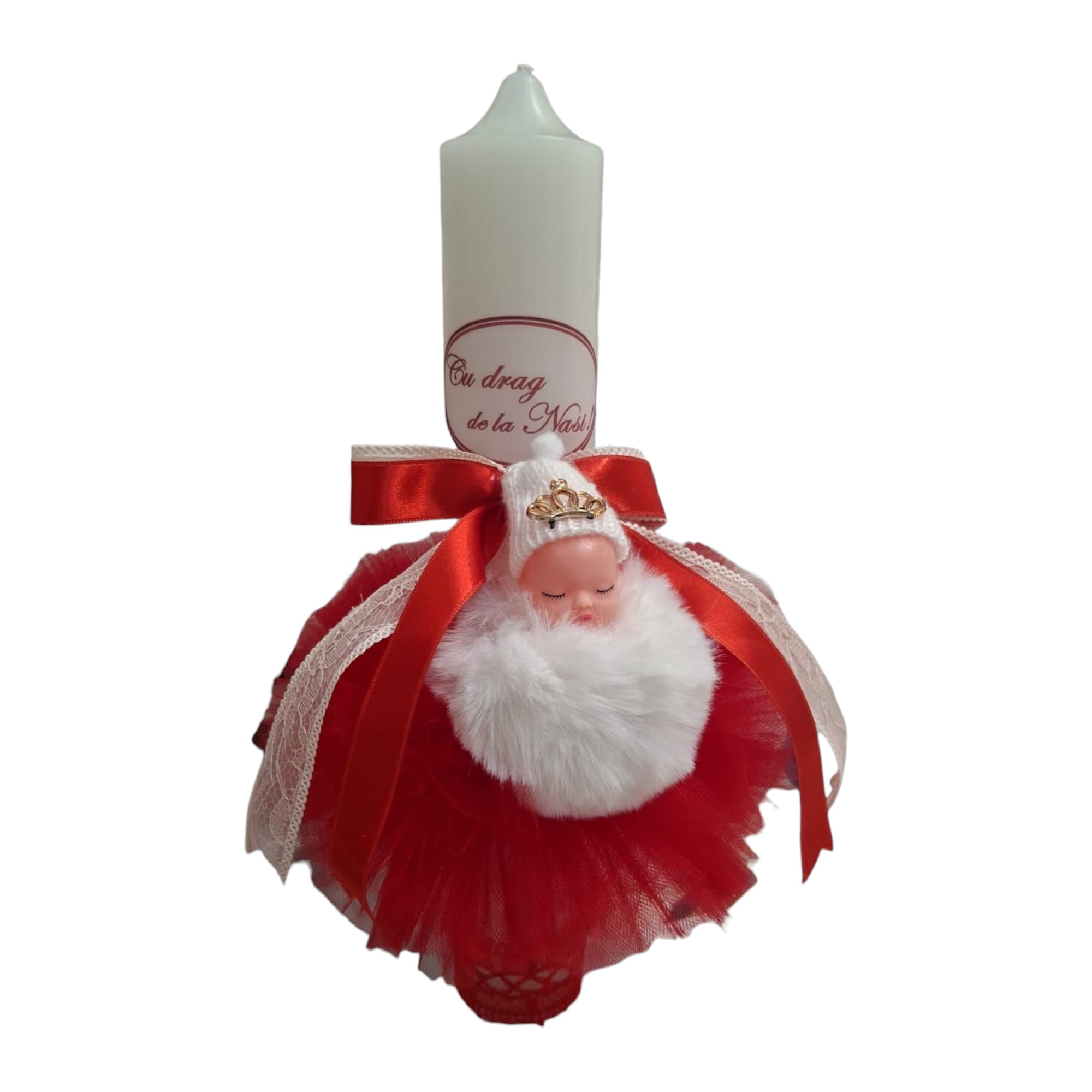 Lumanare de Botez cu Bebelus si Tul Rosu