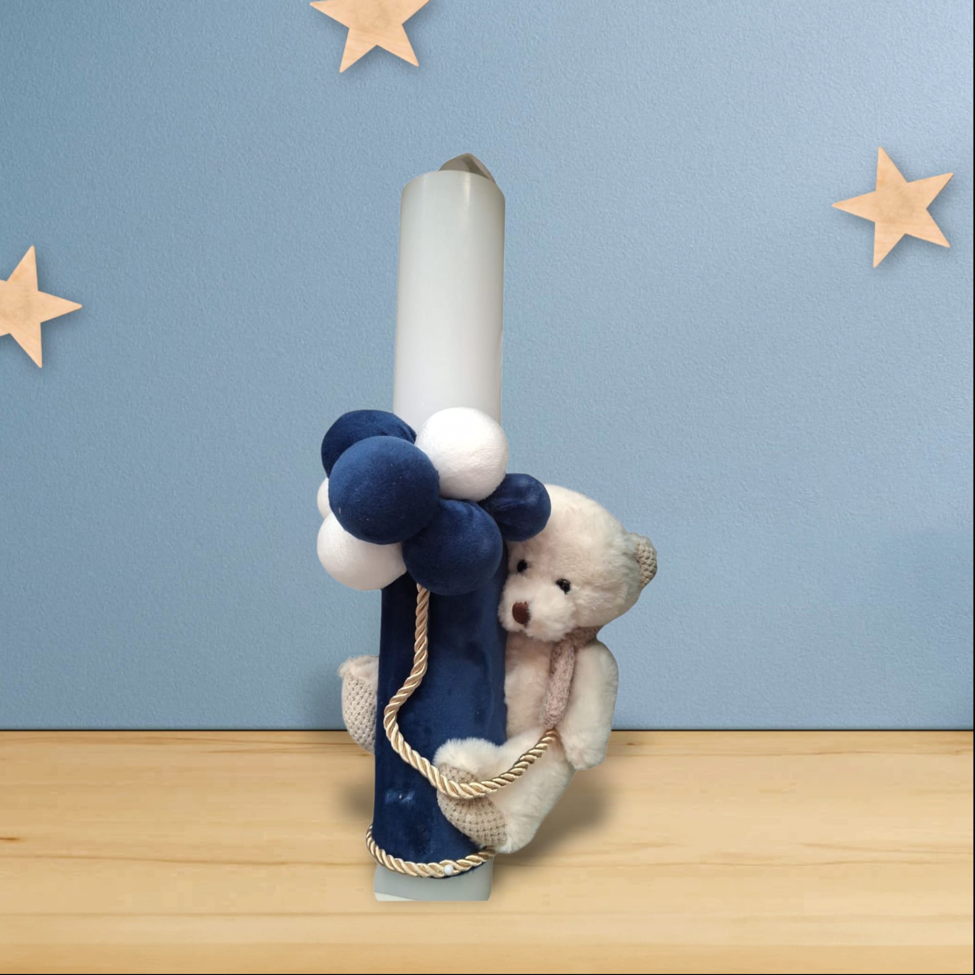 Lumanare de Botez cu Ursulet si Decoratiuni Alb-Albastre 35 cm