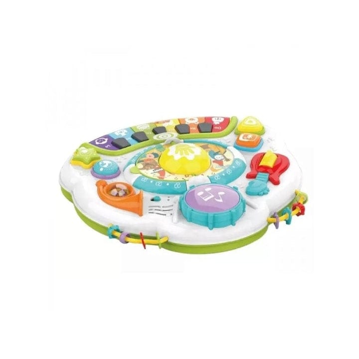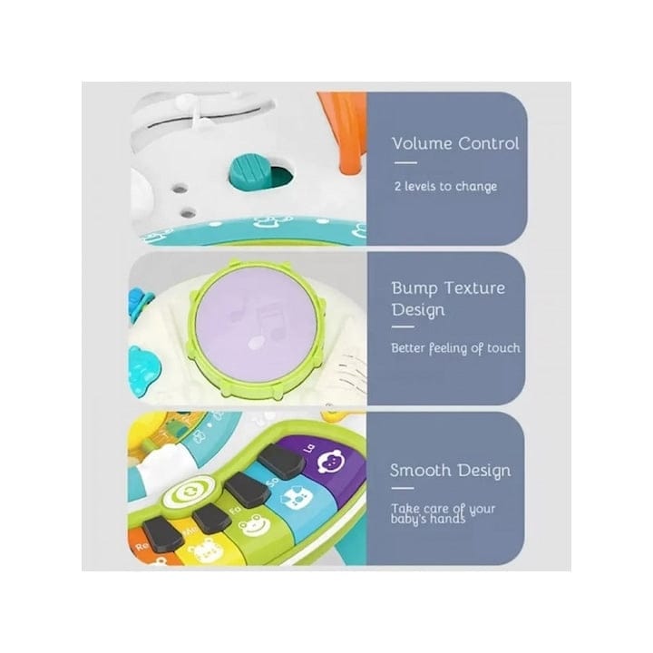Suprafața de joacă include multiple elemente interactive: clape de pian colorate cu sunete muzicale, mini-tobă, butoane cu melodii și efecte sonore, elemente rotative, forme de apăsat și un panou central luminos care atrage atenția și stimulează curiozitatea.
