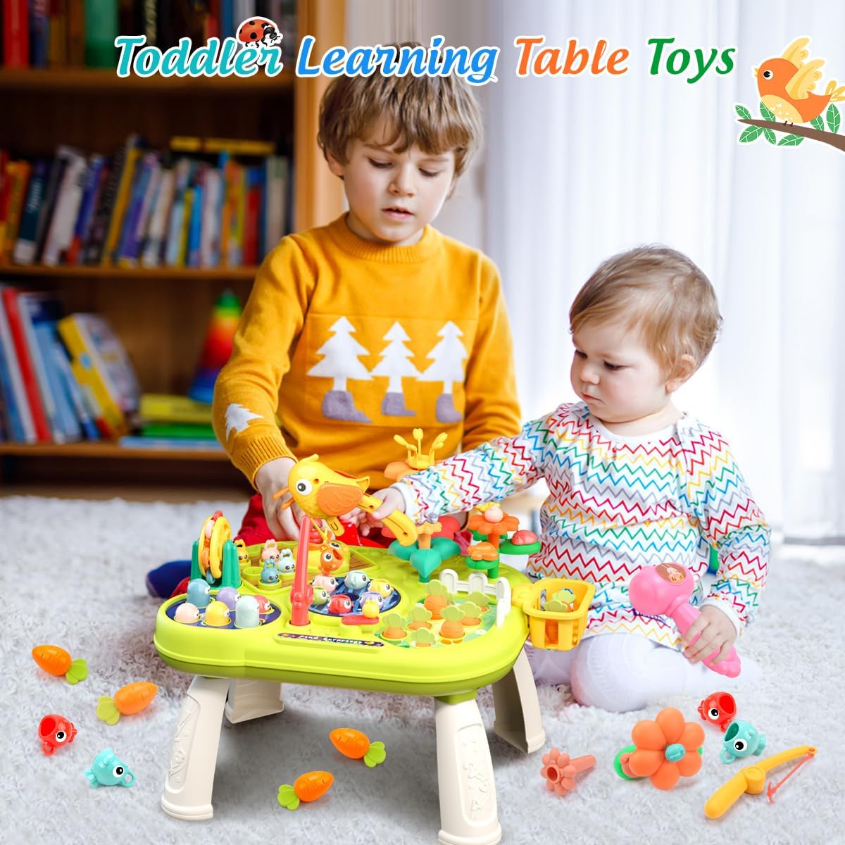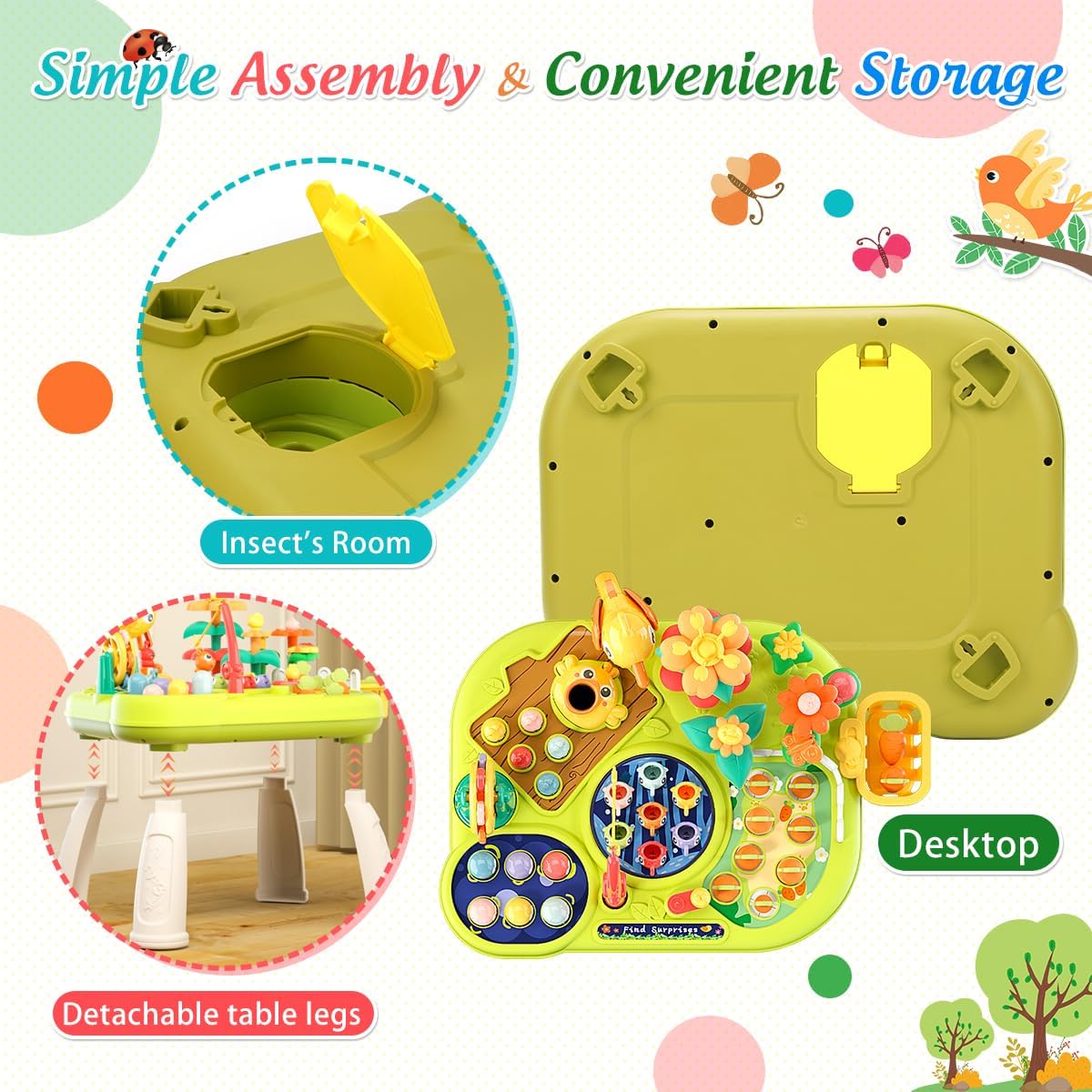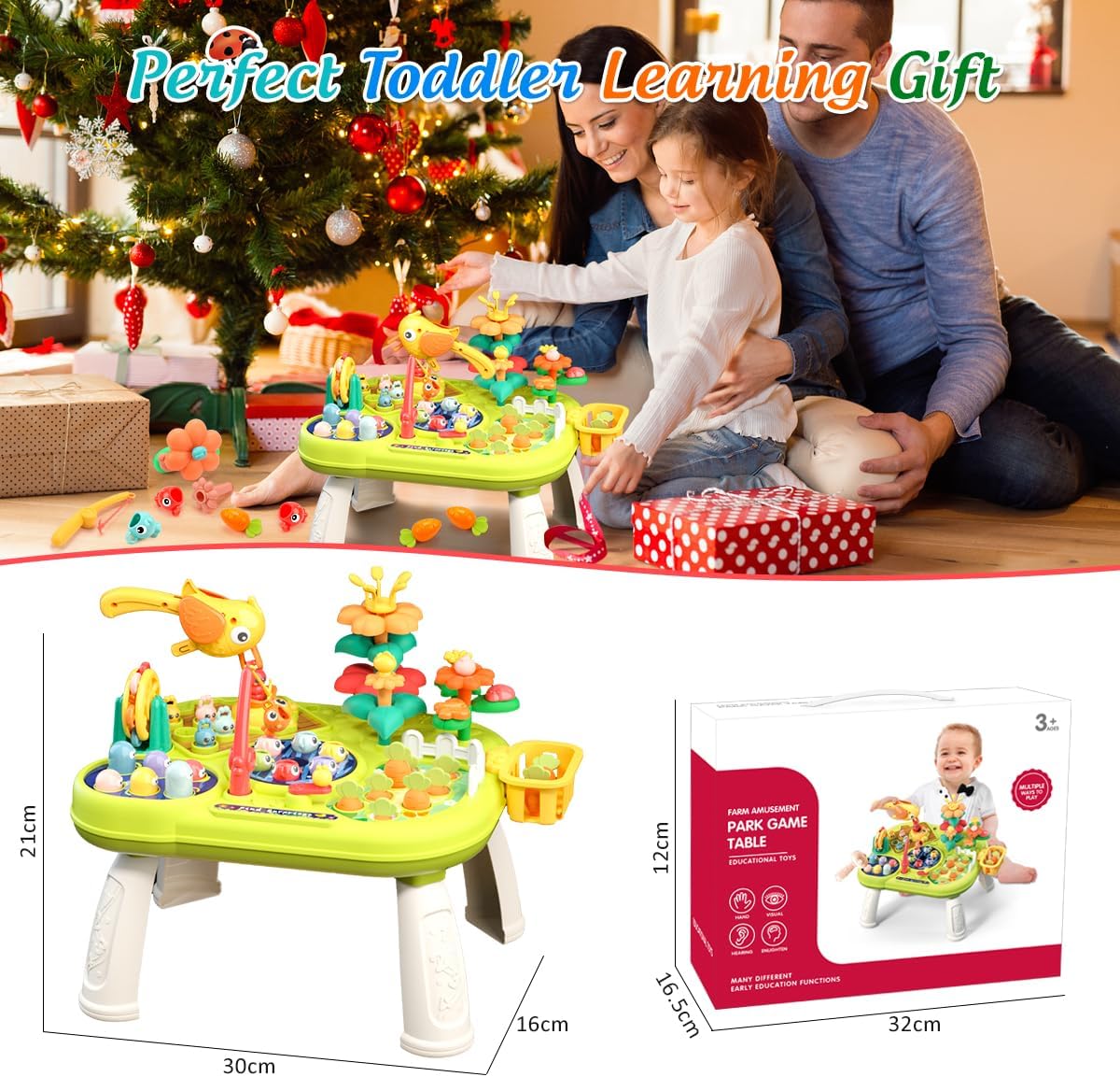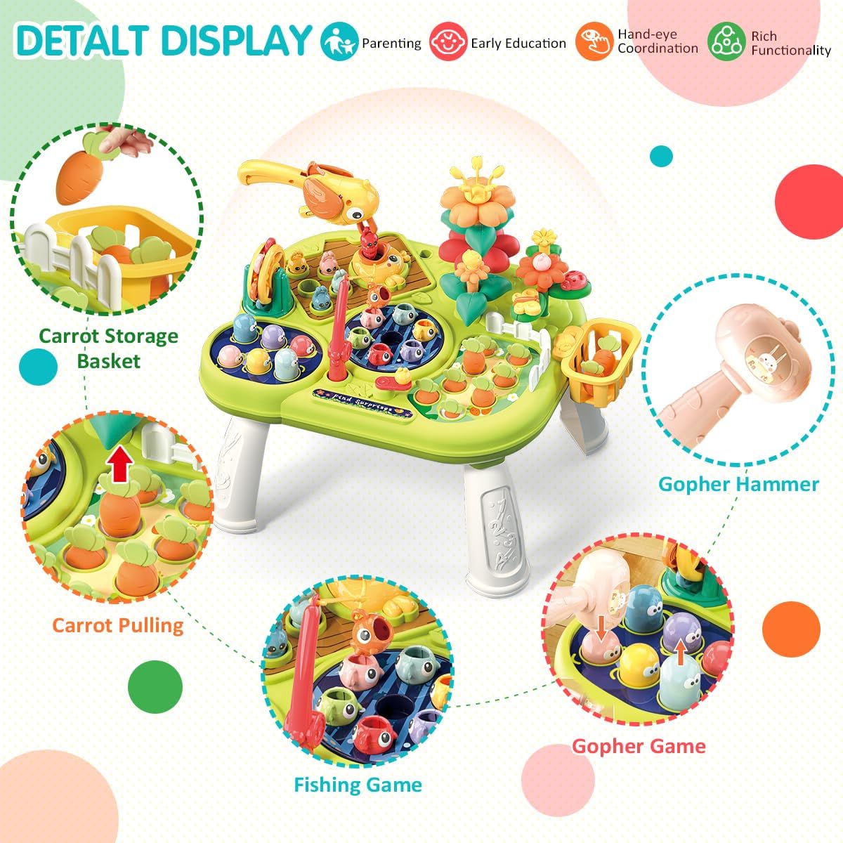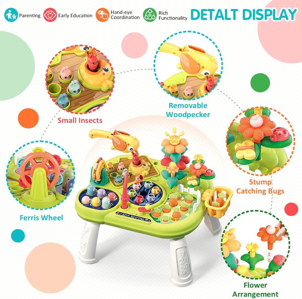 ✔ Multiple jocuri educative: Include jocuri de pescuit, extragerea morcovilor, aranjarea florilor, un ciocănitor detașabil, o roată Ferris, și un joc cu insecte.