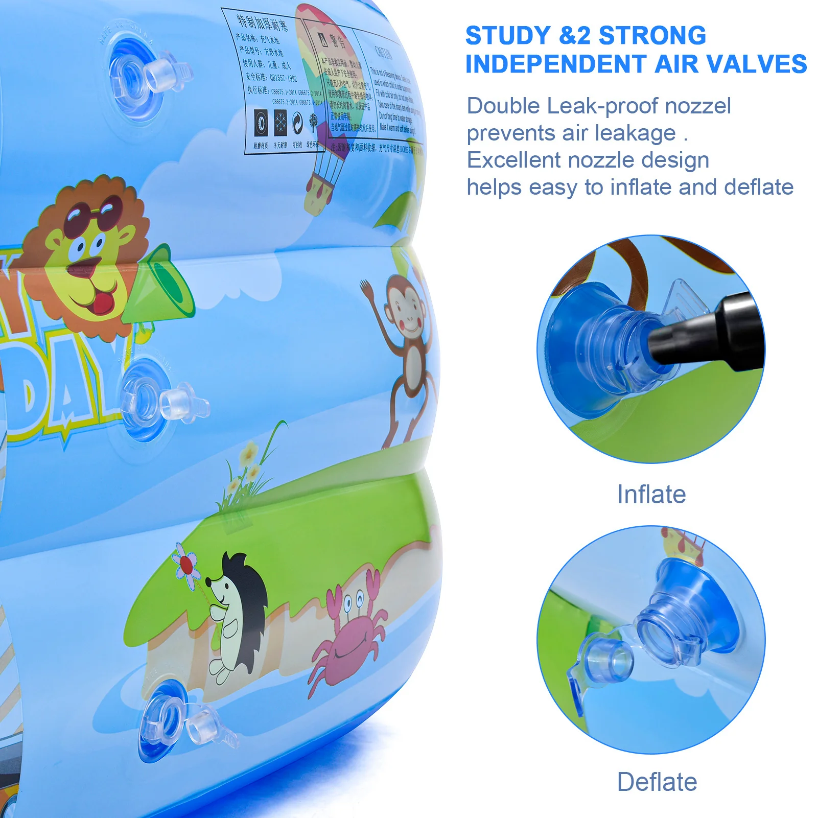 Piscina se montează în doar câteva minute: umflă fiecare cameră de aer cu o pompă manuală sau electrică (nu este inclusă), umple cu apă și… distracția poate începe!