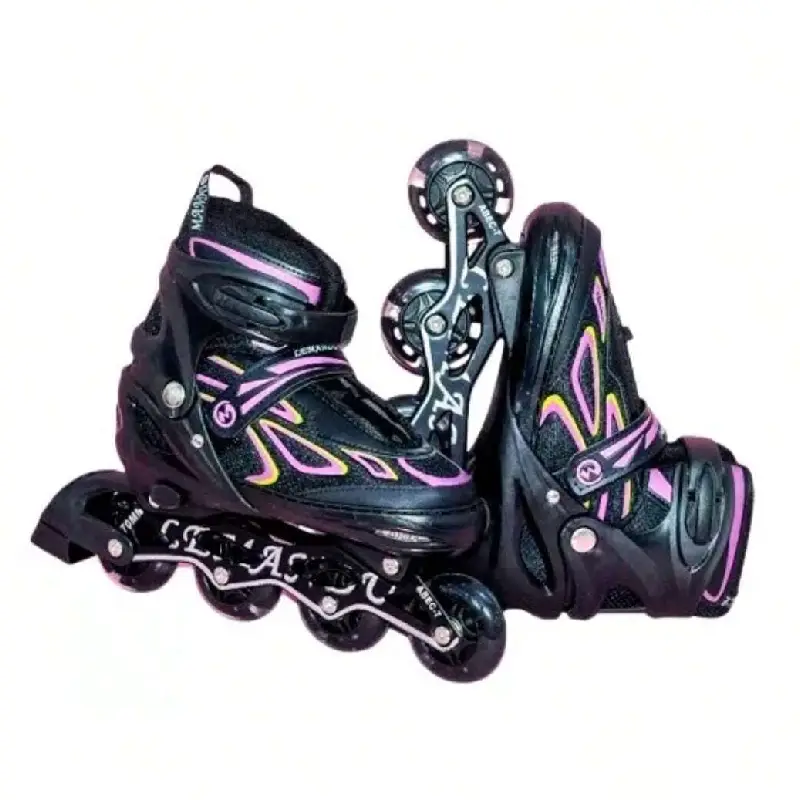 Aceste role inline au un design sportiv și modern, evidențiat prin combinația elegantă de culori: predomină negrul, cu accente vibrante de roz, galben și violet. Aceste culori adaugă un aspect dinamic și energetic, perfect pentru cei care își doresc să iasă în evidență.