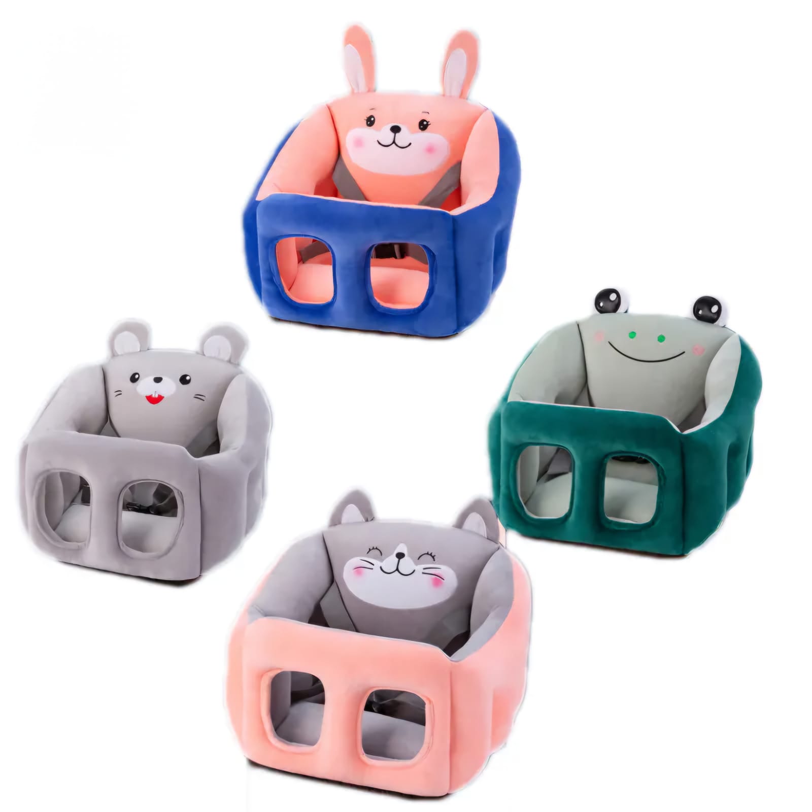 Acesta este un scaunel de pluș pentru bebeluși, conceput pentru a oferi sprijin și confort în perioada în care învață să stea în șezut. Are un design adorabil sub formă de iepuraș, combinând culori atractive (albastru și roz), fiind atât funcțional, cât și estetic plăcut pentru cei mici.