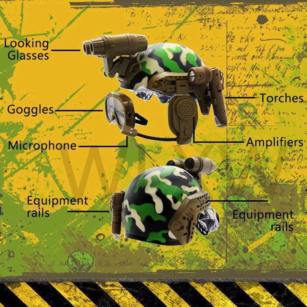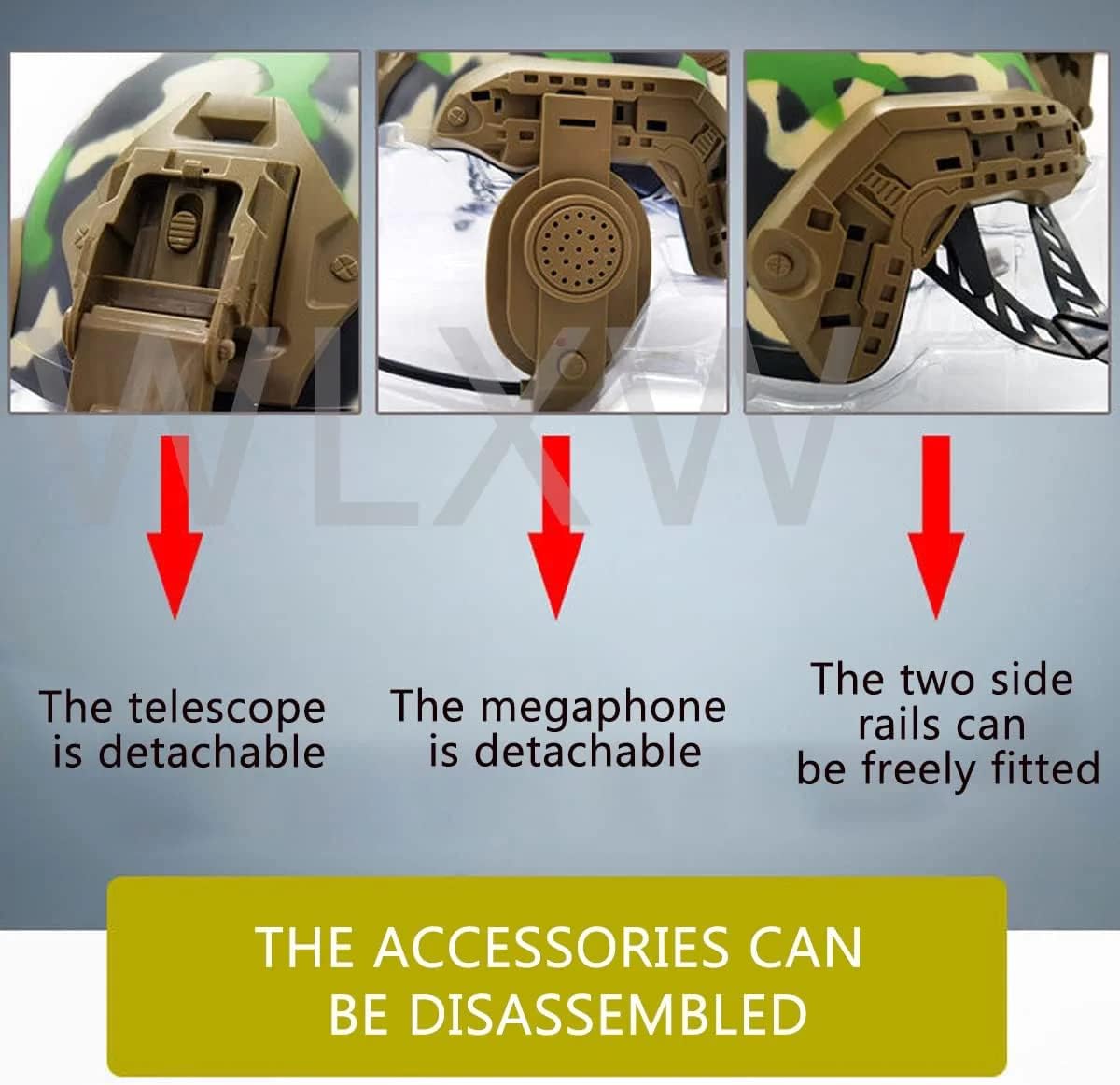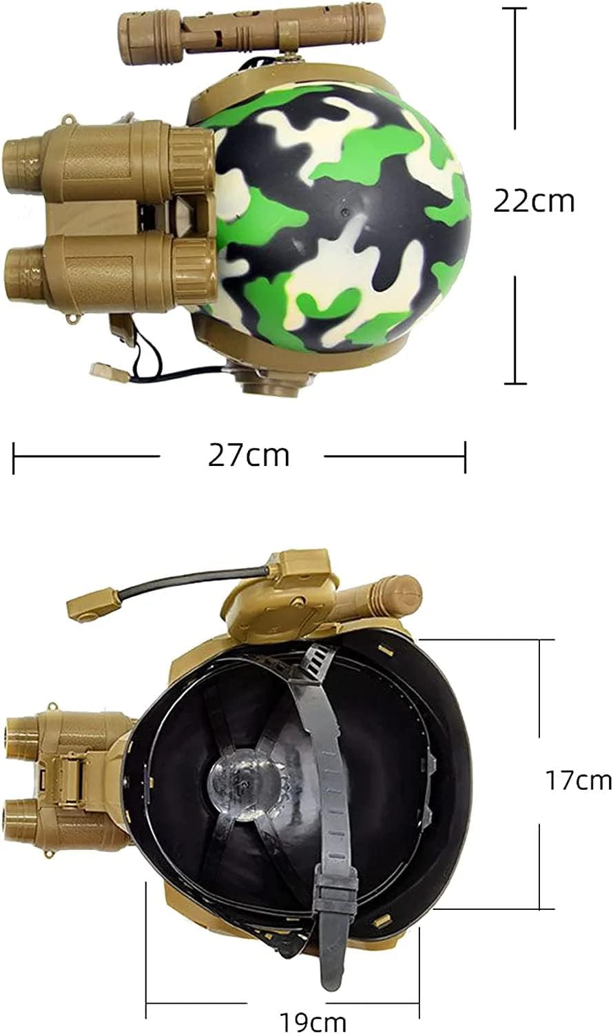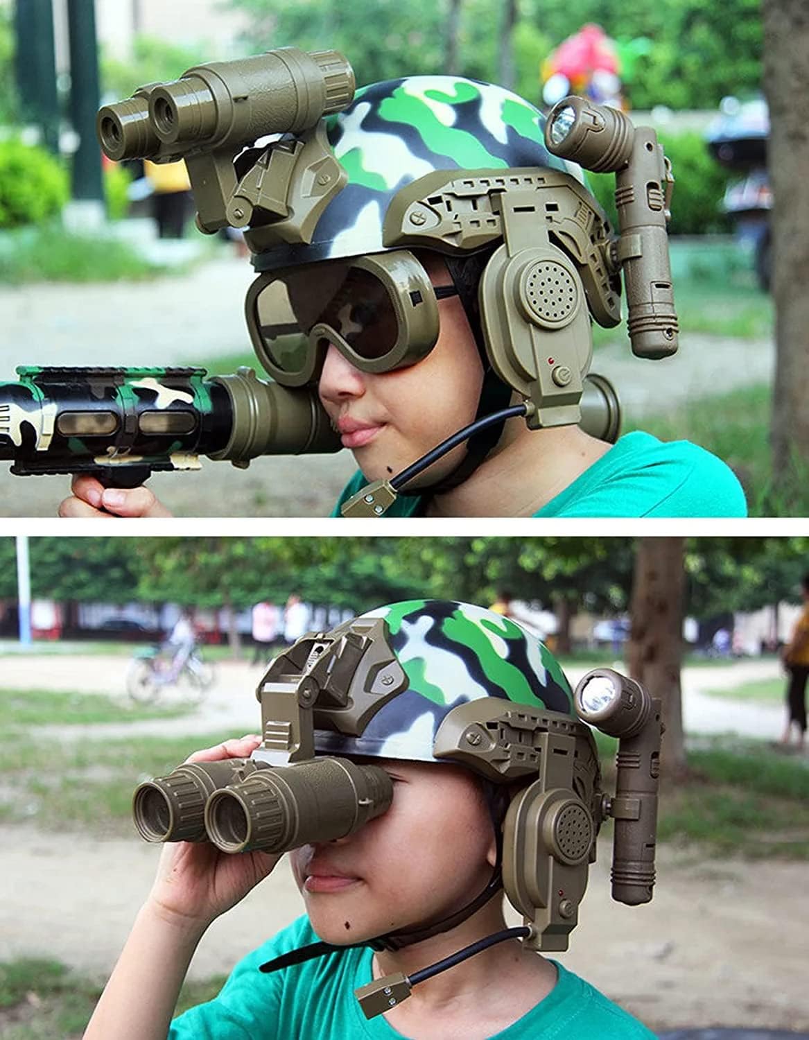 Echipată cu binoclu funcțional, lanternă LED, microfon și ochelari de protecție, casca oferă o experiență realistă de “soldat în misiune”.