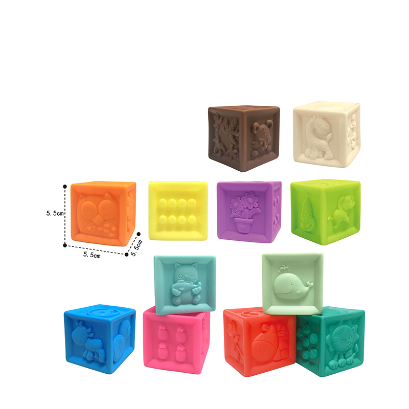 Setul conține 12 cuburi moi din silicon alimentar, fiecare având forme și modele diferite în relief — animale, fructe, numere, forme geometrice și obiecte familiare.