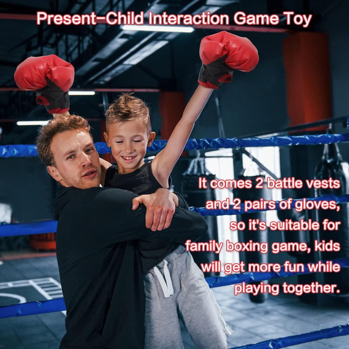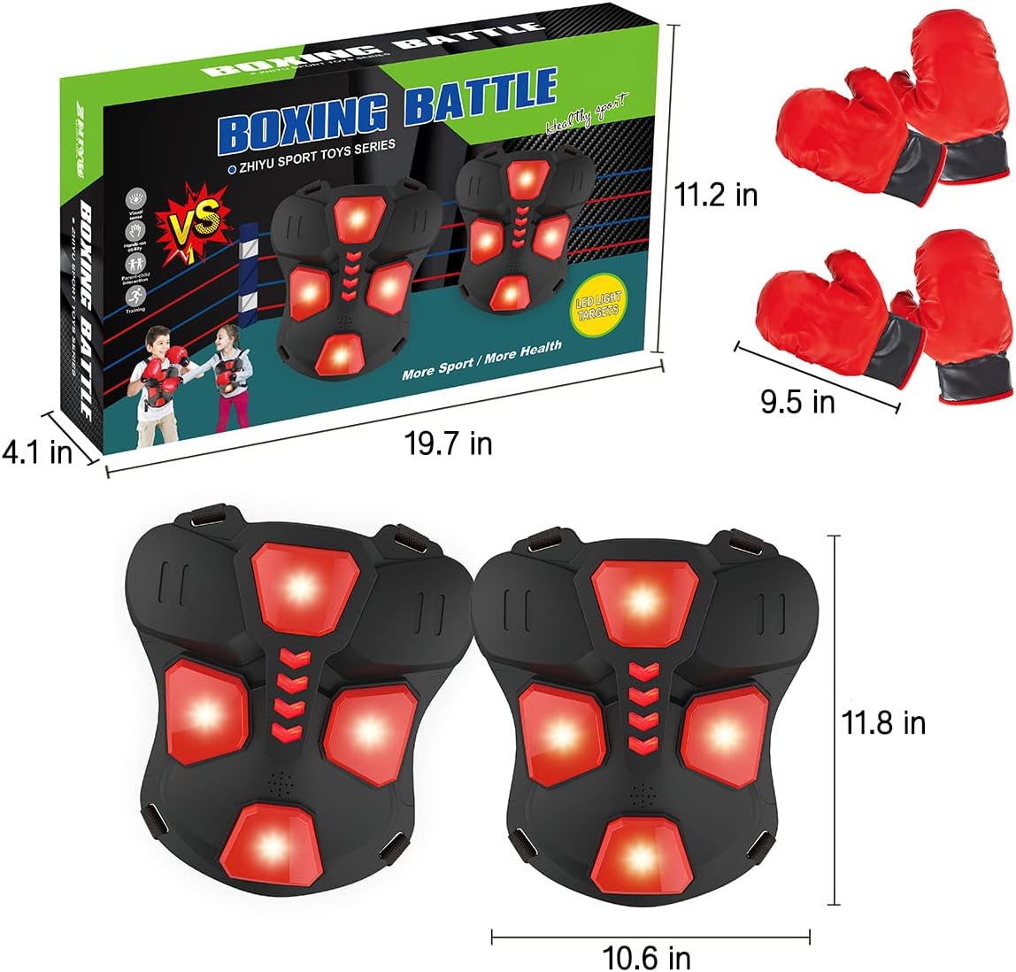 Pachetul include 2 veste de box cu lumini LED și 2 perechi de mănuși moi, special concepute pentru mâinile copiilor. Tot ce au nevoie pentru a începe o luptă amicală și plină de energie! -