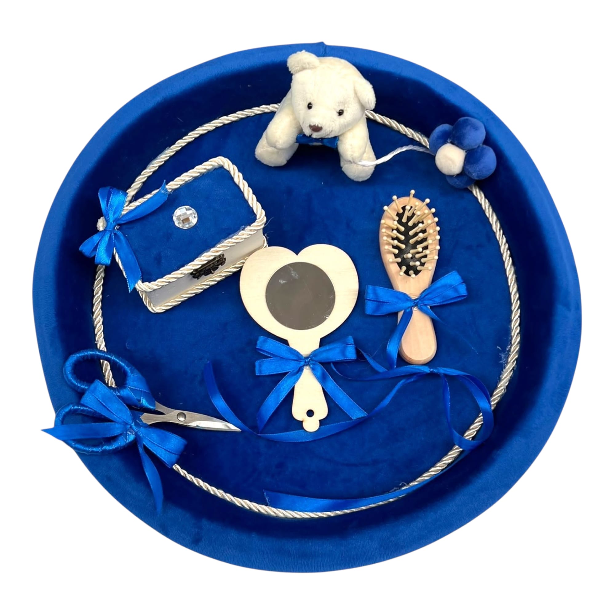 Transformă momentul unic al tăierii moțului într-o amintire de neuitat cu această elegantă tăviță din catifea albastră, decorată cu detalii rafinate și accesorii incluse.