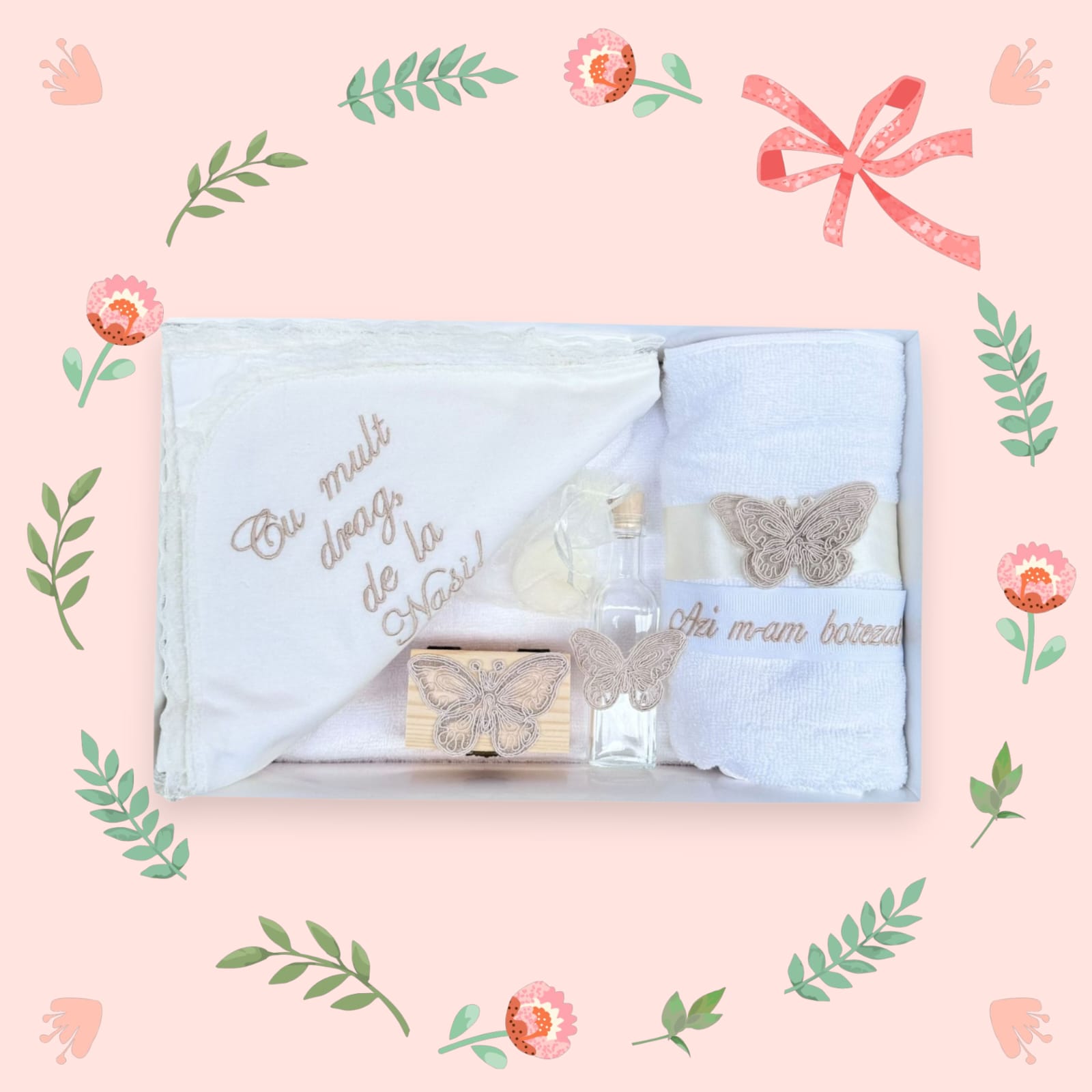Acest trusou de botez cu 7 piese și model fluture este alegerea ideală pentru nașii care doresc să ofere un set complet si tradițional.